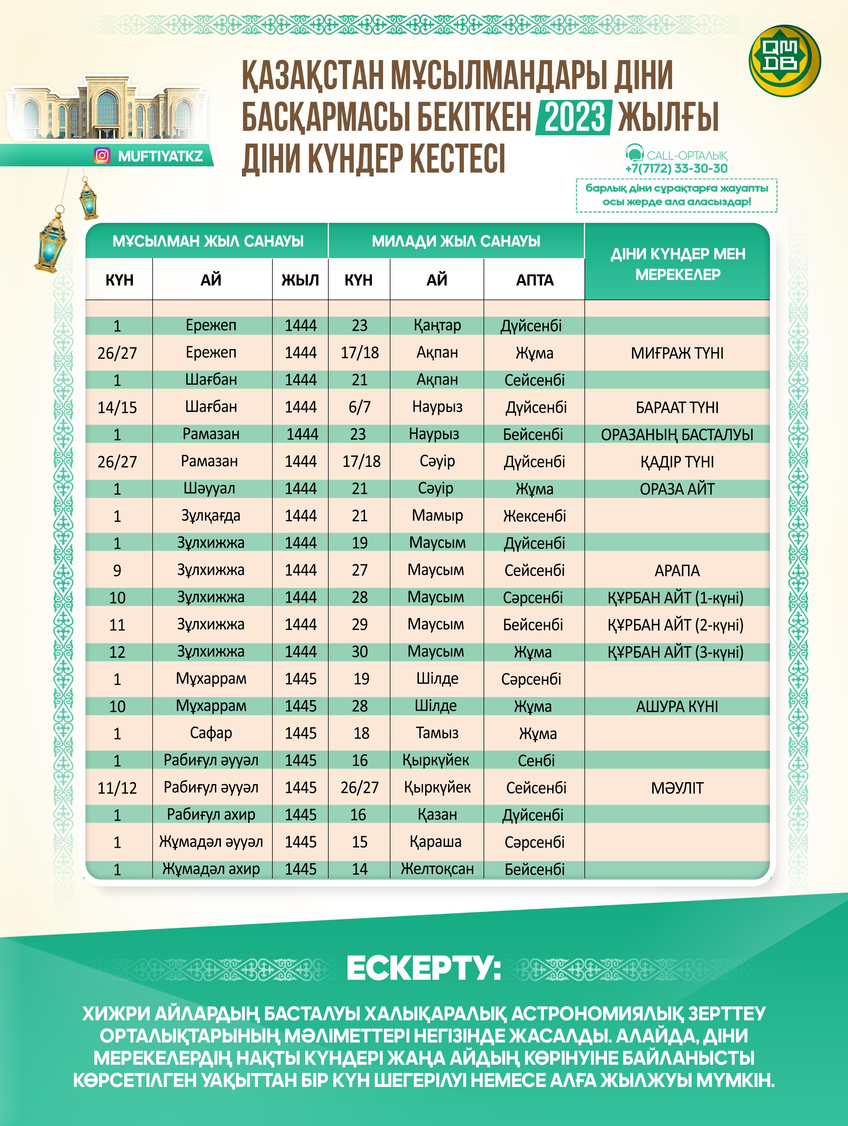 2023 ЖЫЛДЫҢ ДІНИ КҮНДЕР КЕСТЕСІ БЕКІТІЛДІ