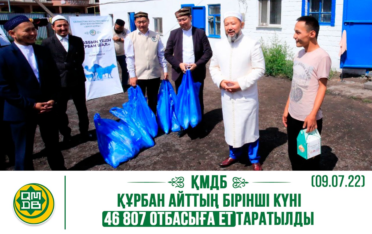 Құрбан айттың алғашқы күні, яғни, 9 шілдедегі мәлімет бойынша республика көлемінде жалпы саны 14 435 мал шалынса, 2600-ге жуық тапсырыс qurban2022.kz сайты арқылы берілген. Тарқатып айтсақ, қой – 12 786, ешкі – 845, ірі қара – 796, түйе – 8. Барлық мәліметті жинақтап айтқанда, еліміз бойынша 46 807 отбасыға құрбандық еті таратылды.