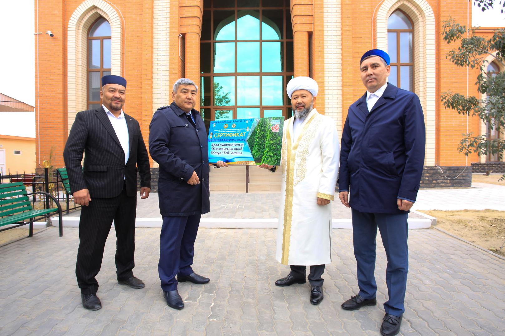 Қазақстан мұсылмандары діни басқармасының төрағасы Наурызбай қажы Тағанұлы Қызылорда облысына барған сапарында Арал аудандық мешітінде аймақ басшысы Серік Сермағамбетке Арал ауданының 95 жылдық мерейтойына орай 100 түп туя ағашының сертификатын табыстады.