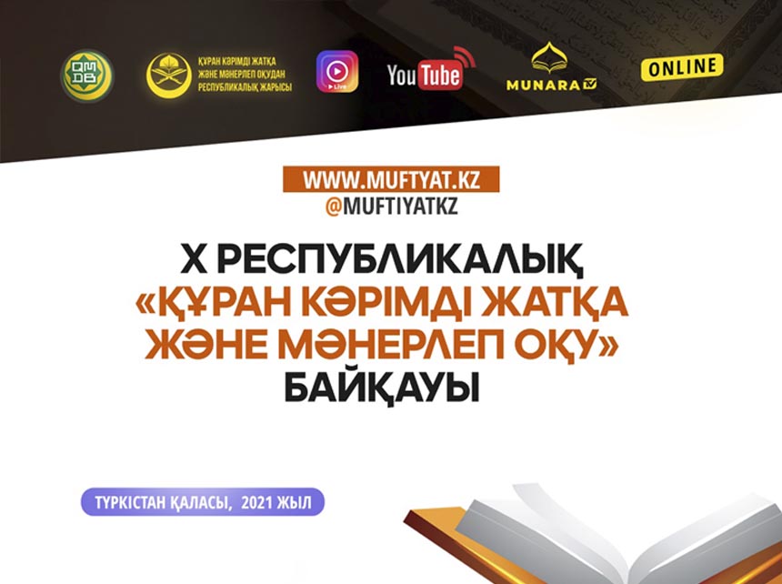 12-13 қазан күндері Құран Кәрімнің 10, 20, 30 парасын жатқа және мәнерлеп оқу номинациялары бойынша өтетін байқау сонымен қатар «Муфтият ҚМДБ» Youtube арнасы мен @muftiyatkz инстаграм парақшасы арқылы онлайн көрсетіледі.