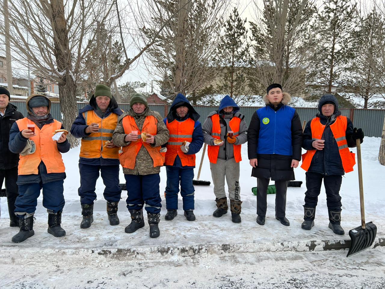 Соның ішінде қалалық «AQ MESHIT» мешітінің бас имамы Дәурен Мүслимов бастаған қызметкерлер де сауапты іске атсалысты. Қаңтардың аязды күндерінде қар басып қалған қала көшелерін тазалап жүрген қызметшілерге бір уақыт ыстық тамақ ұсынып, ыстық шаймен бойын жылытып, аз уақыт болса да дем басуына мұрсат беру – үлкен сауап.