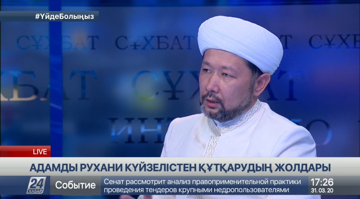 «Адамды рухани күйзелістен құтқарудың жолдары» атты тақырыпта сұхбат берген Бас мүфти төтенше жағдайға байланысты ҚМДБ Ғұламалар кеңесінің шығарған пәтуасын таныстырып, карантин кезінде ораза ұстау, уақытты тиімді пайдалану, құлшылықты арттыру, дұға жасаудың маңызы сынды бірқатар сауалдар төңірегінде ой-кеңестерімен бөлісті.