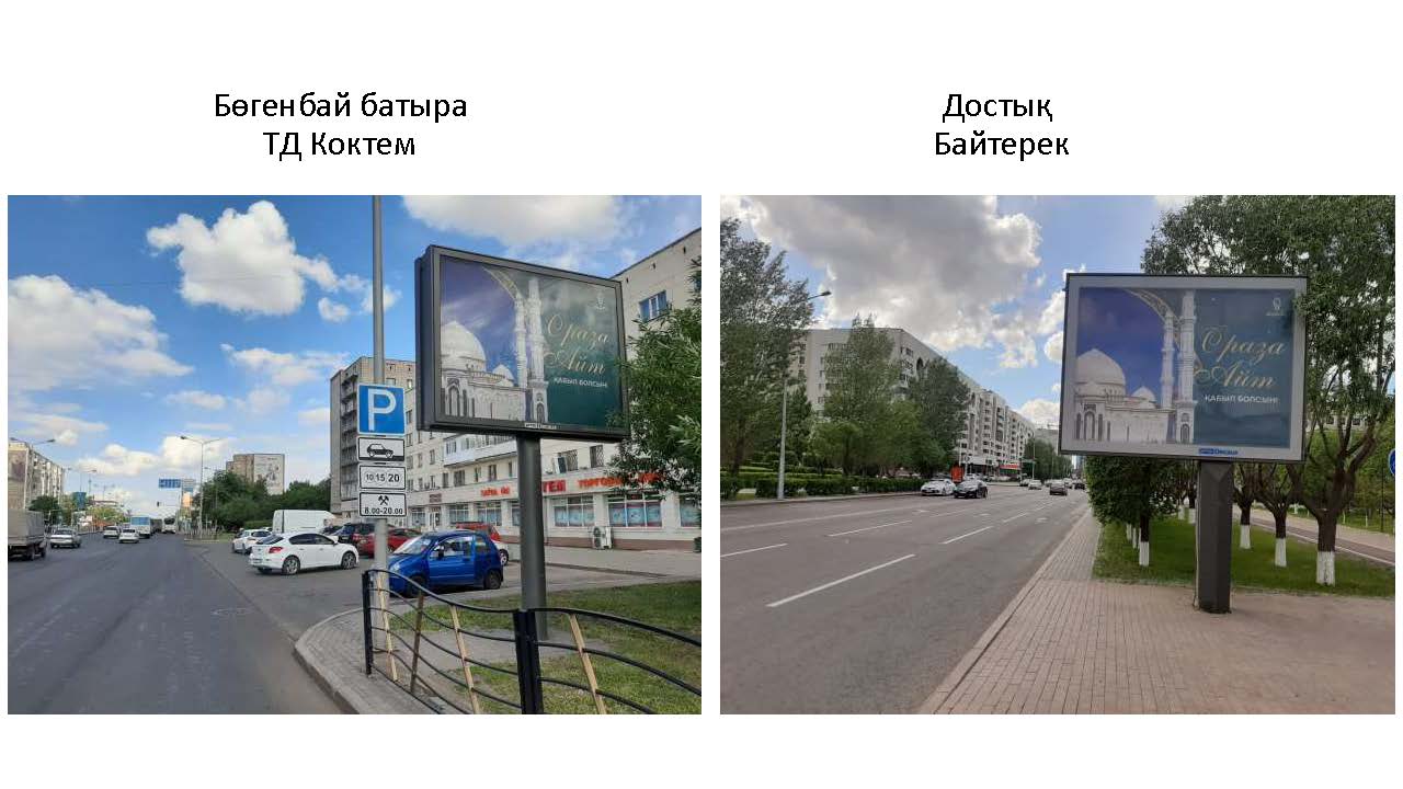 «Ораза айт қабыл болсын!» деп жазылған республикалық «Әзірет Сұлтан» және елорданың «Нұр-Астана» мешіттері бейнеленген мұндай құттықтау баннерлерді қаламыздың барлық бұрышынан кездестіруге болады. Бұл да болса елордалық тұрғындарының еңсесін көтеріп, мерекелік көңіл-күй сыйлайтын ерекше қадам болды.