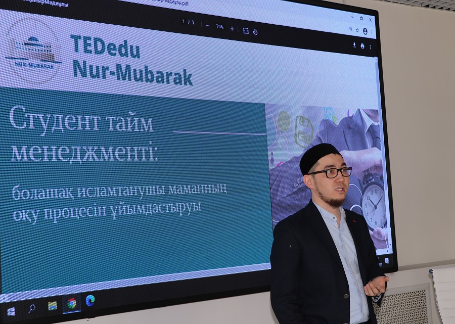 «Студенттің тайм-менеджменті: болашақ исламтанушы маманның оқу процесін ұйымдастыруы» уақытты үнемдеу жайлы тренингі жоспарлы мезеттен де асып жығылды. Себебі студенттер үшін тәжірибелі «бұрынғы» студенттің «аз уақытта» бірнеше тілді меңгерген бүгінгі PhD докторант әрі оқытушыға айналуының өзі көп мағлұмат бергендей, сауалдары туындап жатты. Исламтану кафедрасының оқытушысы, исламтанушы Әбілқайыр Мәдиұлы тайм-менеджмент дәрісінде ғұламалар өмірлерінен мысалдар келтіріп, бүгінгі «қаптап кеткен тренинтерде» айтыла бермейтін құнды мәліметтермен бөлісті. Әбілқайыр Жұматаев сонымен бірге жақсы әдет қалыптастырудың да жолдарын бірінші курс студенттеріне жайып салды.