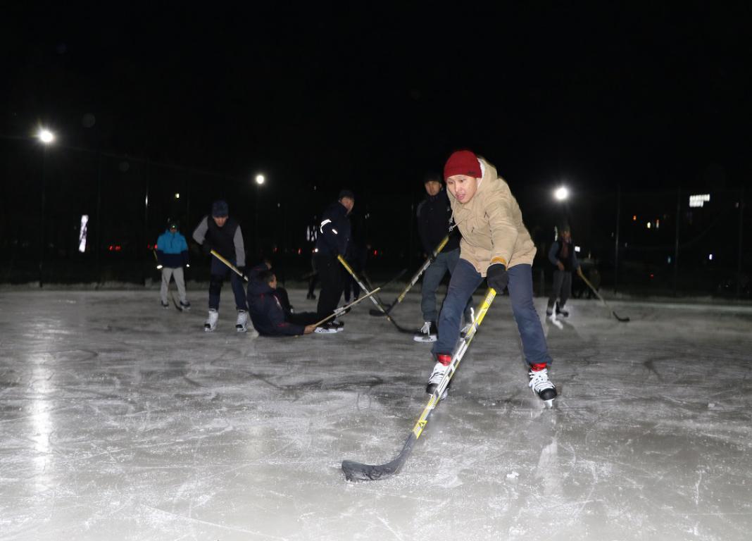 Мұз алаңында шайбаға таласқан университет қызметкерлері мұның қарбалас жұмыс күнінен кейін тамаша сергу алаңы болғанын атап өтті.