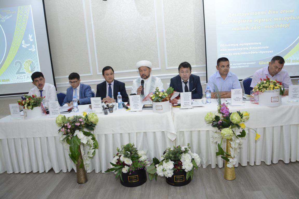 Айта кету керек, облыстық дін істері басқармасының «Дін мәселелерін зерттеу орталығы» МКМ-нің ұйымдастыруымен өткен семинар-тренингіне елімізге танымал теология және философия ғылымдарының докторы, профессор Д.Кенжетай, ҚР Қоғамдық даму министрлігі Дін істері комитетінің Исламдық діни бірлестіктермен байланыстар басқармасының бас сарапшысы Н.Қабылов, Ақтөбе облысы дін істері басқармасының «Аңсар» ақпараттық-талдау орталығы КММ басшысы Ж.Сүлейменов, Оңтүстік Қазақстан мемлекеттік педагогикалық университетінің аға оқытушысы, тарих ғылымдарының кандидаты Қ.Анарбаевтар мен Түркістан облысы және Шымкент қаласы бойынша өкілдігінің бас имамдары қатысты.