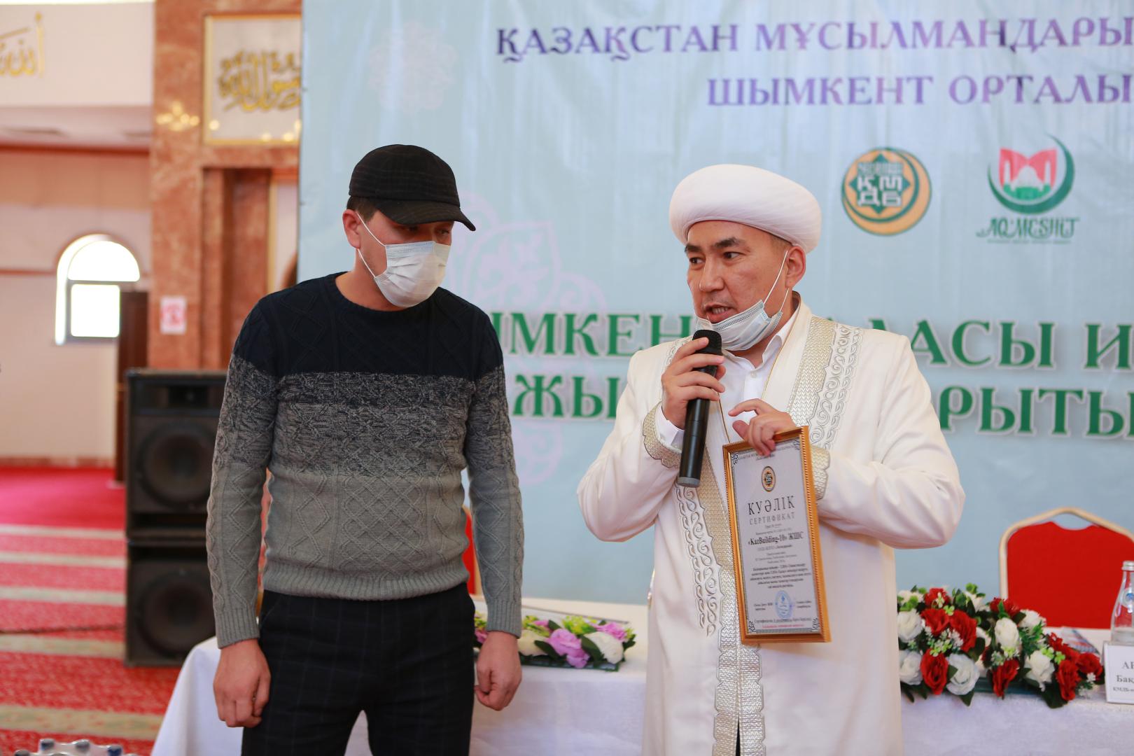 ҚМДБ Шымкент орталық мешітінде өткен жылдық қорытынды есепте түрлі сусындар шығаратын «KazBuilding-10» ЖШС ҚМДБ-ның «Халал Даму» ұйымының сертификатына ие болды.