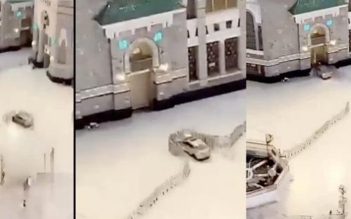 Очевидцы опубликовали в сети видео с инцидентом. На нем видно, как машина на огромной скорости едет в сторону одной из дверей мусульманской святыни.