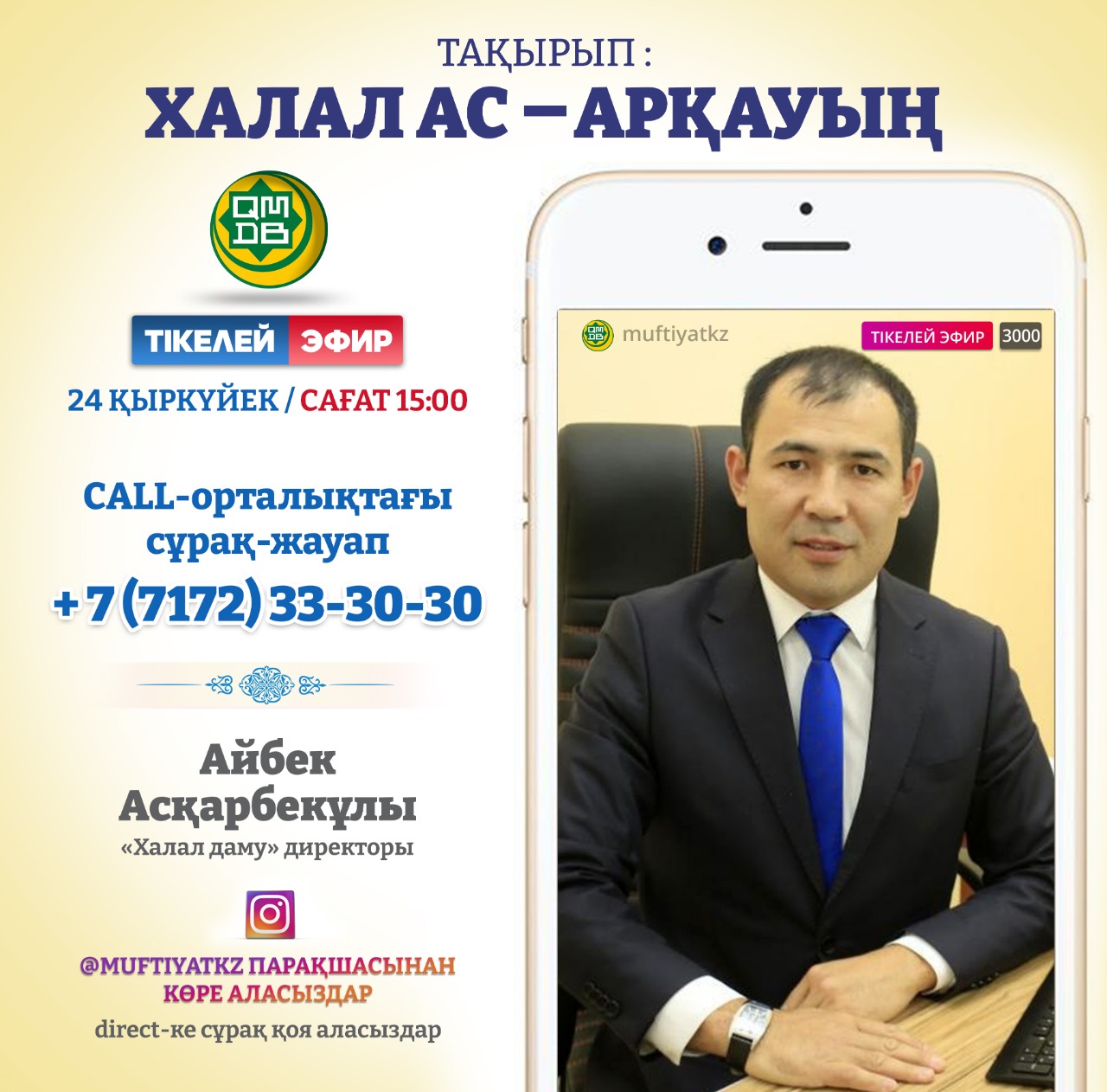 Сегодня, 24 сентября, в 15:00 Айбек Аташев, директор «Халал Даму» ДУМК, ответит на вопросы на тему «Халал ас – арқауың» (Халяльная еда – источник силы).