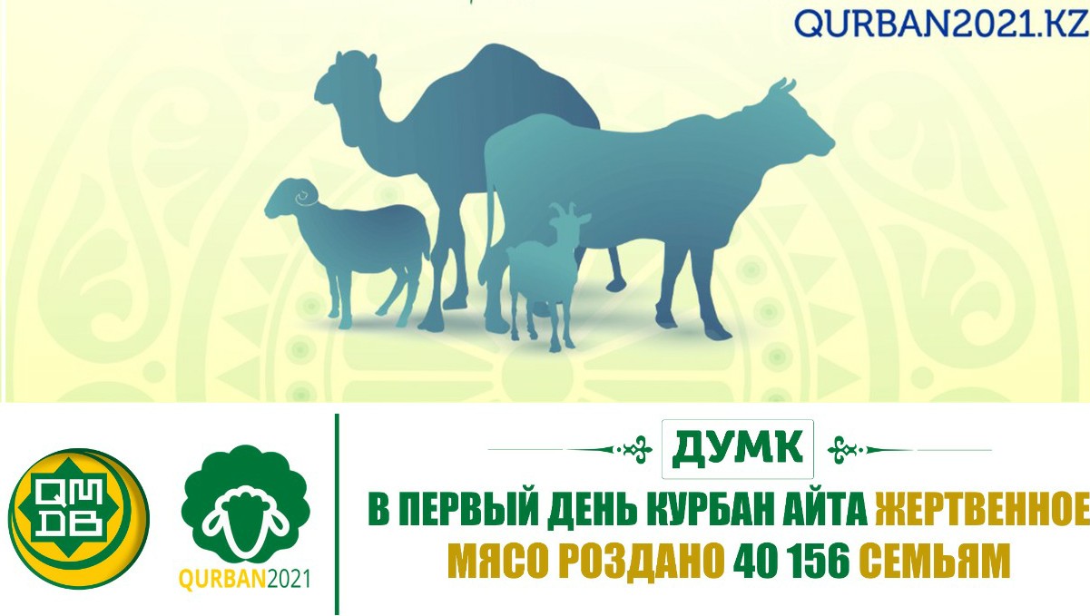 По состоянию на первый день Курбан Айта, 20 июля, по республике 2132 человека заказали услугу жертвоприношения через сайт qurban2021.kz, и в общей сложности по всей стране было забито 7670 животных. Из них 6740 овец, 603 крупного рогатого скота, 318 коз, 9 верблюдов. Всего жертвенное мясо было роздано 40 156 семьям по всей стране.