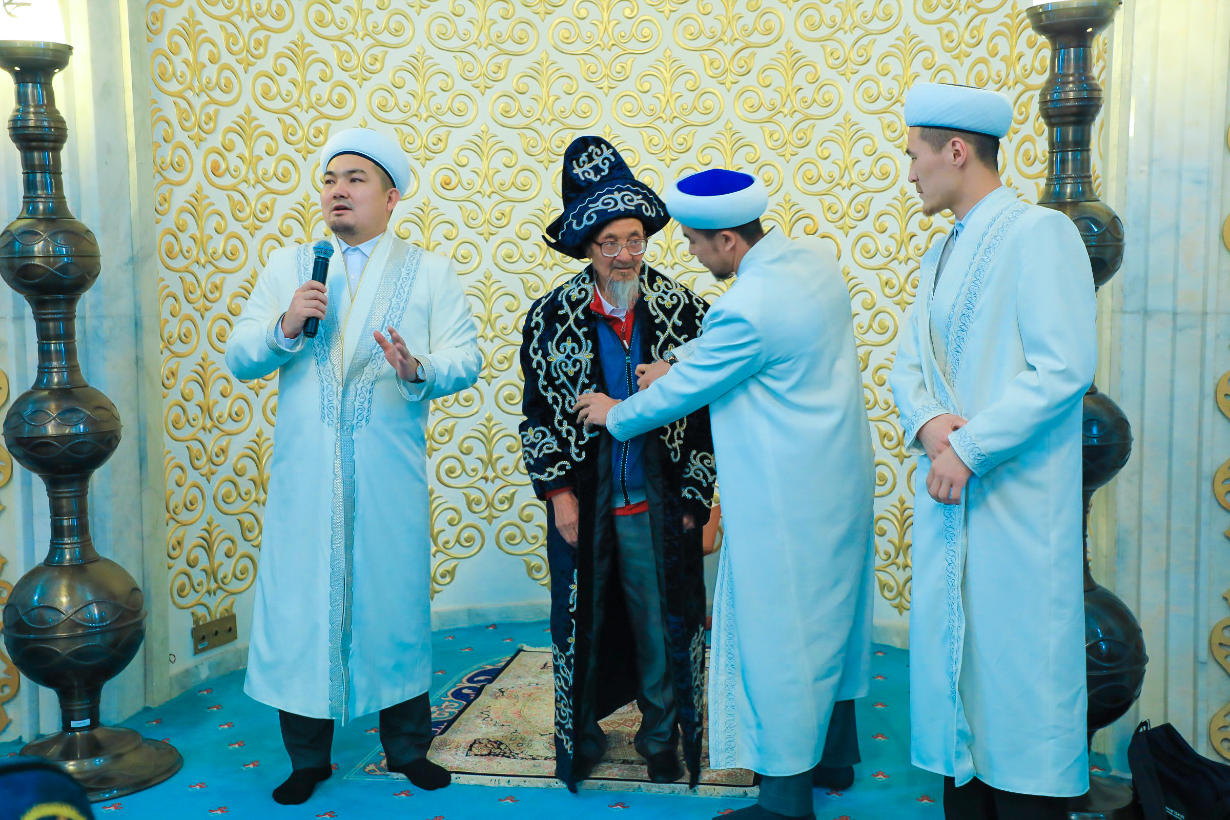 В минувшую священную пятницу, Сансызбая Токенулы, вернувшегося из умры, чествовали перед собравшимися в мечети «Хазрет Султан» в Астане. Главный имам мечети Ерболат Жусупов по традиционному казахскому обычаю накинул на плечи старейшины мечети чапан.