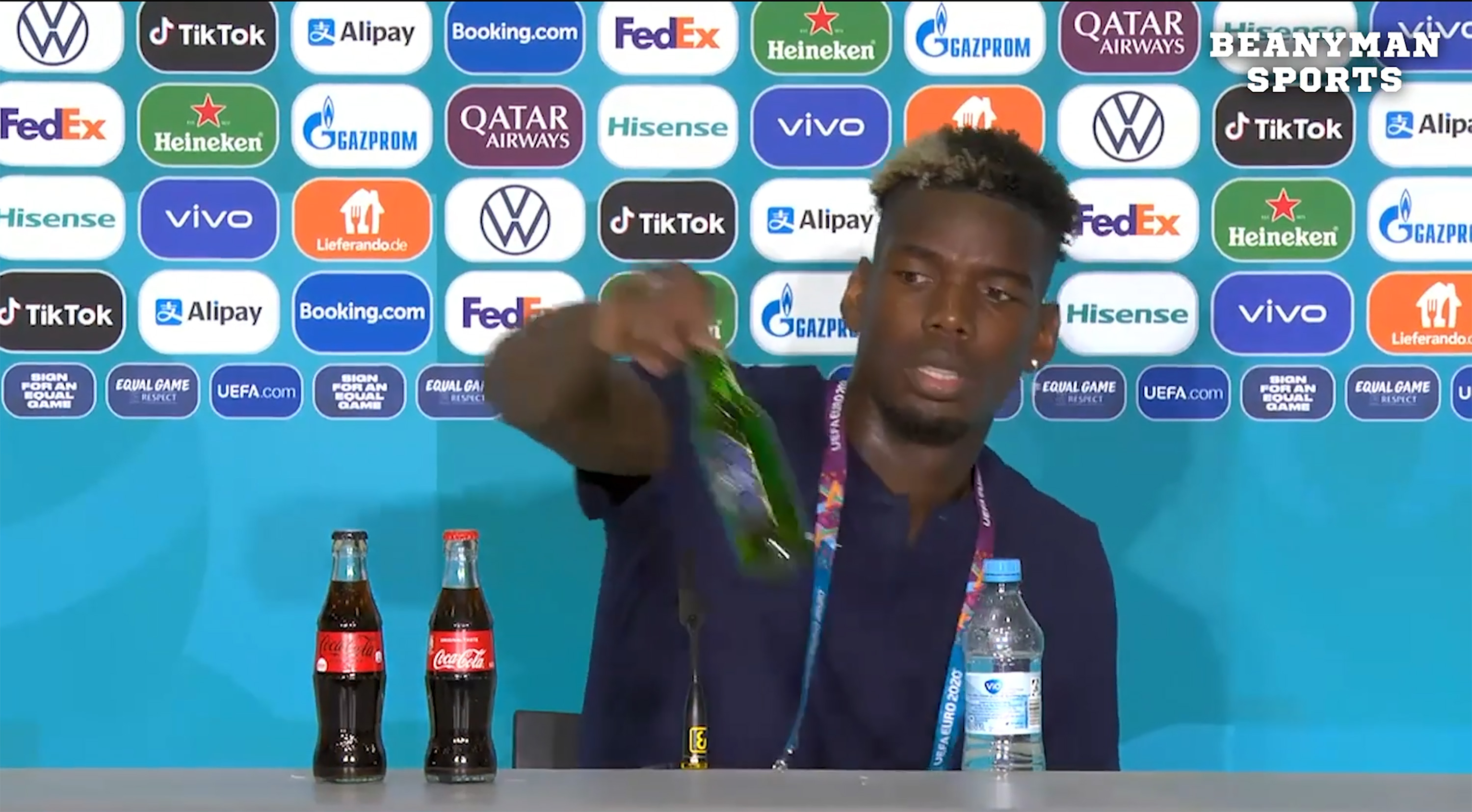 Придя после победного матча с Германией (1:0) в конференц-зал на общение с представителями прессы, Погба увидел на столе бутылку с пивом. Футболист убрал эту бутылку на пол, оставив на столе воду и две бутылки Coca-Cola.