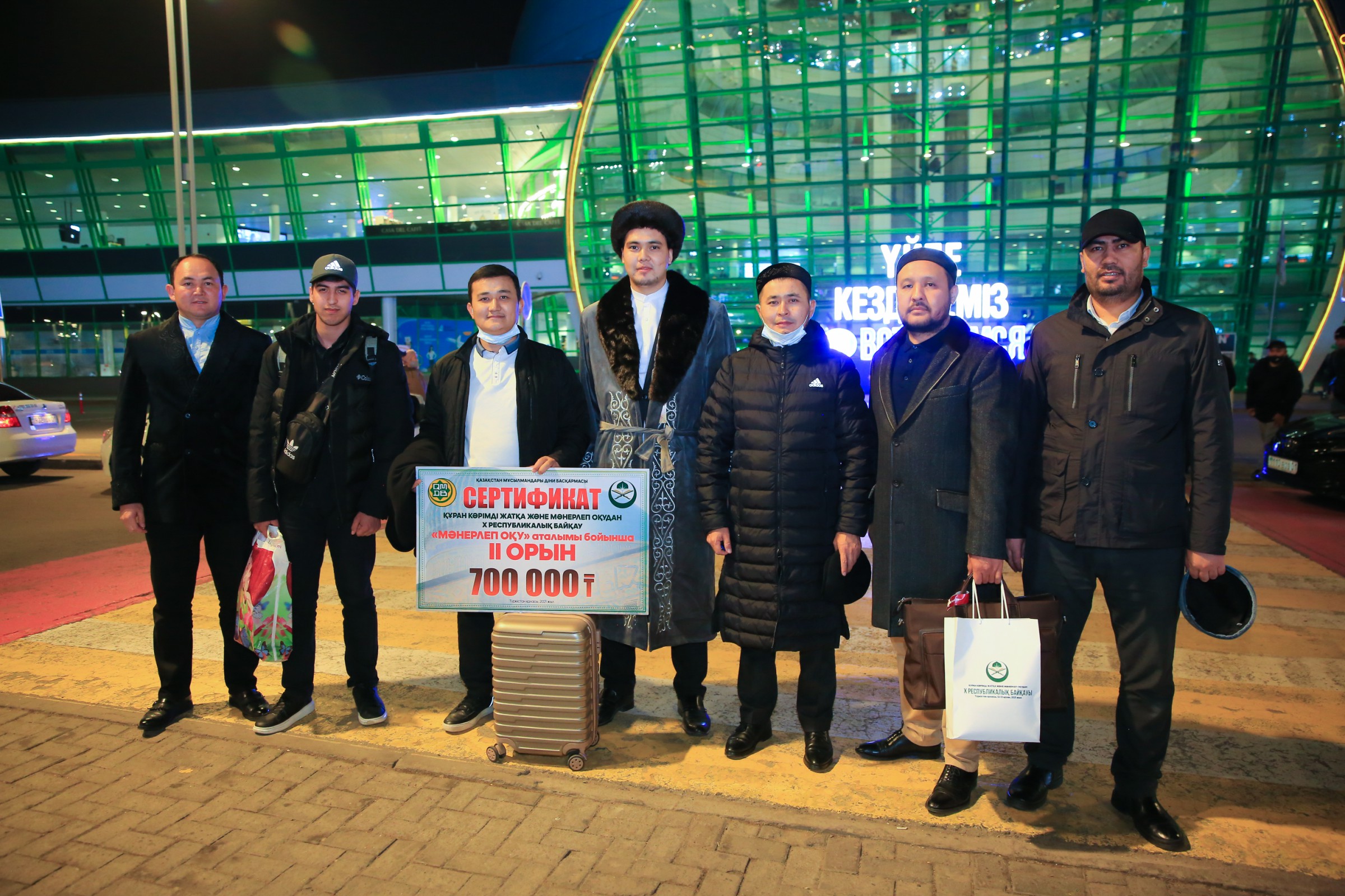 Вчера в аэропорту г.Нур-Султан коллектив Республиканской мечети почтил молодого человека, отстоявшего честь и достоинство столицы на Республиканском конкурсе чтецов Священного Кур`ана. Коллеги поздравили призёра и по казахской традиции одели на плечи чапан.