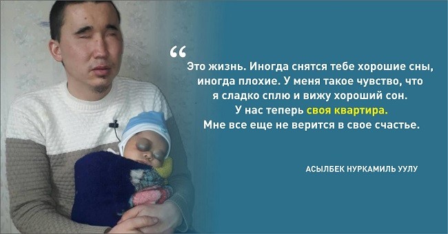 “Я очень счастлив. Это жизнь. Иногда снятся тебе хорошие сны, иногда плохие. У меня такое чувство, что я сладко сплю и вижу хороший сон. У нас теперь своя квартира. Мне все еще не верится в свое счастье. Пусть Аллах обережет наше счастье. Спасибо всем, кто подарил нам квартиру», - сказал Асылбек.