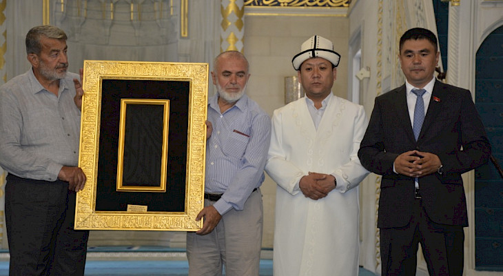 Турция подарила центральной мечети Кыргызстана кусок кисвы – покрывало Каабы, сделанное из черного шелка с узором золотыми нитями.