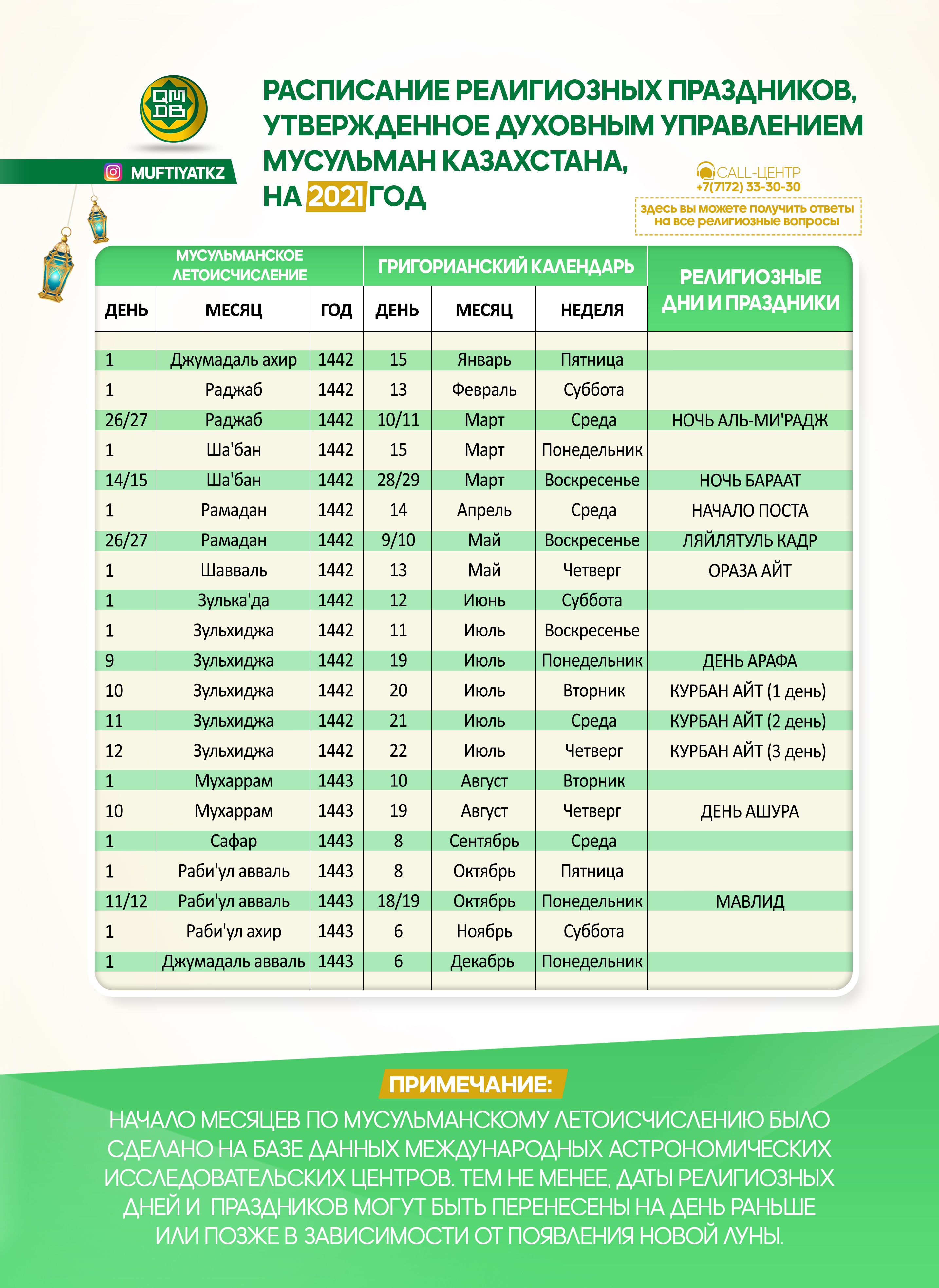 Отдел шариата и фетвы Духовного управления мусульман Казахстана утвердил расписание религиозных дней на 2021 год.