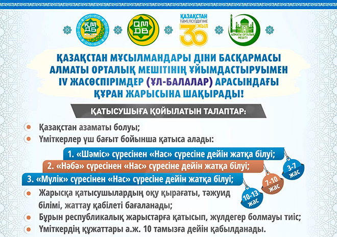 В Алматы пройдет IV молодежный конкурс Кyр`ана среди мальчиков и девочек