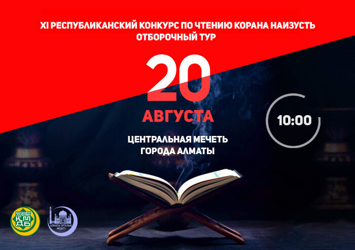 20 августа, 2022 года в Центральной мечети г. Алматы пройдет отборочный тур ХI Республиканского конкурса по чтению Кyр`ана наизусть, организованный представительством ДУМК по г. Алматы.