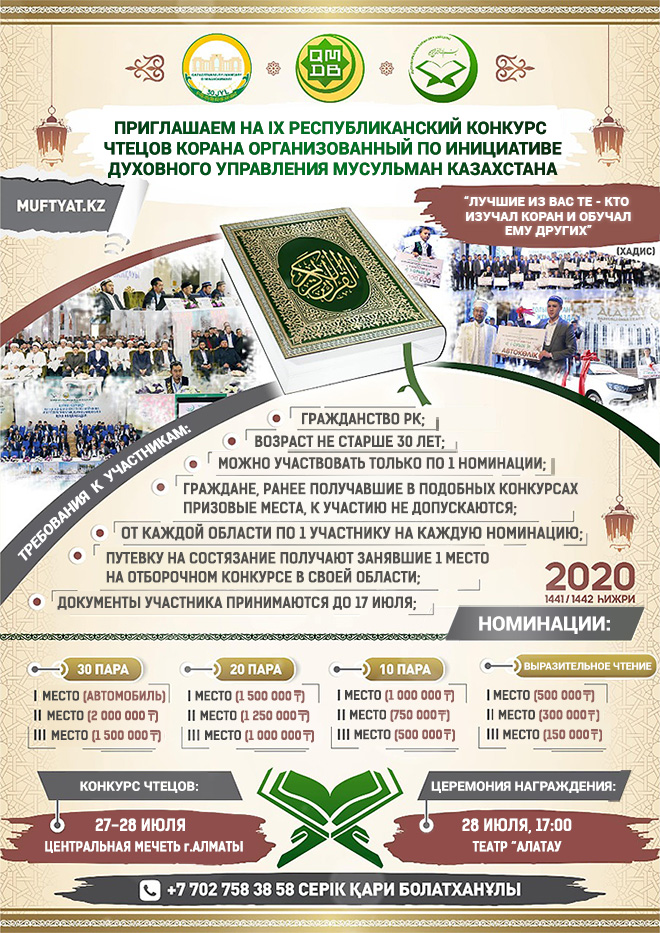 27-28 июля 2020 года в Алматы состоится IX Республиканский конкурс чтецов Кур`ана организованный по инициативе Духовного управления мусульман Казахстана