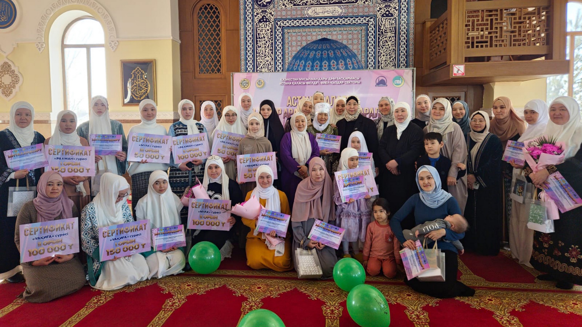 В соответствии с этой тенденцией среди девушек был проведен конкурс по знанию наизусть трех сур Кур`ана («Уакиа», «Ар-Рохман», «Аль-Мульк»), организованный Женским сектором представительства ДУМК г.Астана, победительницы которого были награждены специальными памятными призами.