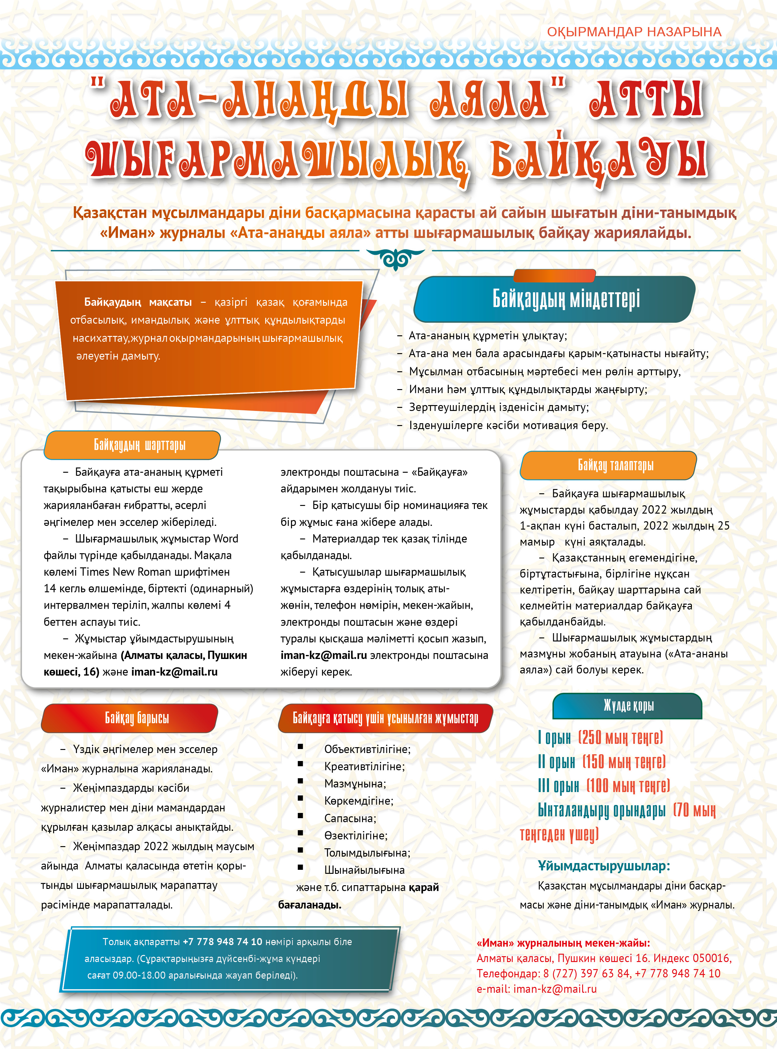 Религиозно-просветительский журнал «Иман», издаваемый раз в месяц при Духовном управлении мусульман Казахстана, объявляет творческий конкурс «Берегите своих родителей».
